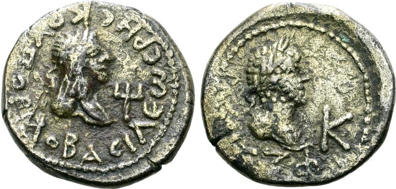 - Бюст императора вправо, внизу год ΓΞΦ (563 г. б. э.), справа К