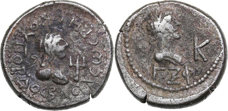 - Бюст императора вправо, внизу год ΓΞΦ (563 г. б. э.), справа К