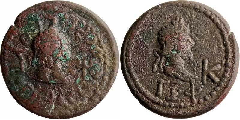 - Бюст императора вправо, внизу год ΓΞΦ (563 г. б. э.), справа К