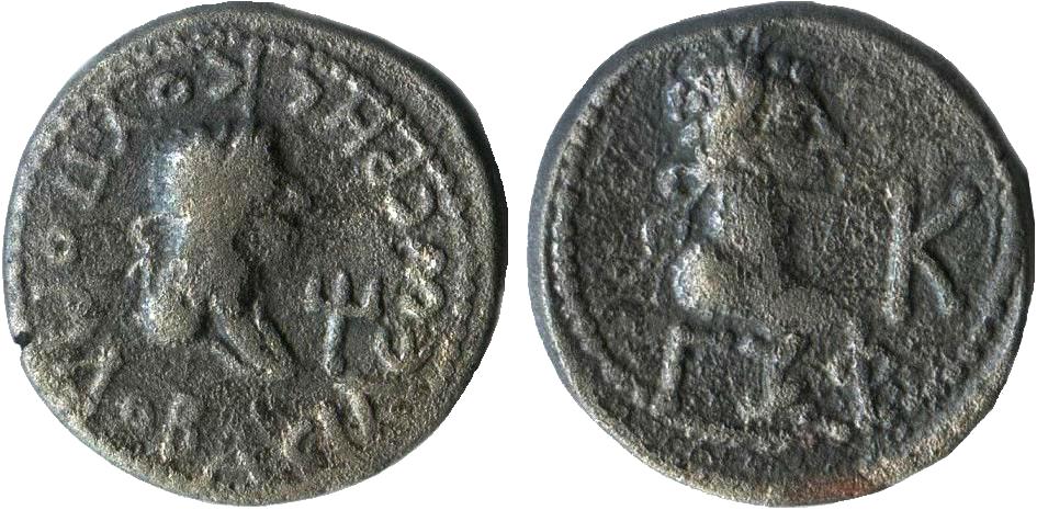 - Бюст императора вправо, внизу год ΓΞΦ (563 г. б. э.), справа К