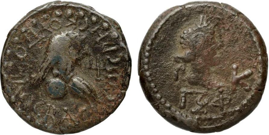- Бюст императора вправо, внизу год ΓΞΦ (563 г. б. э.), справа К