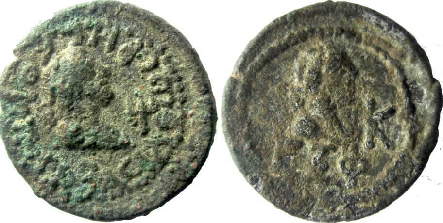 - Бюст императора вправо, внизу год ΓΞΦ (563 г. б. э.), справа К