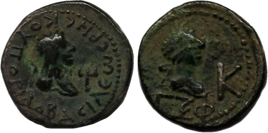 - Бюст императора вправо, внизу год ΓΞΦ (563 г. б. э.), справа К