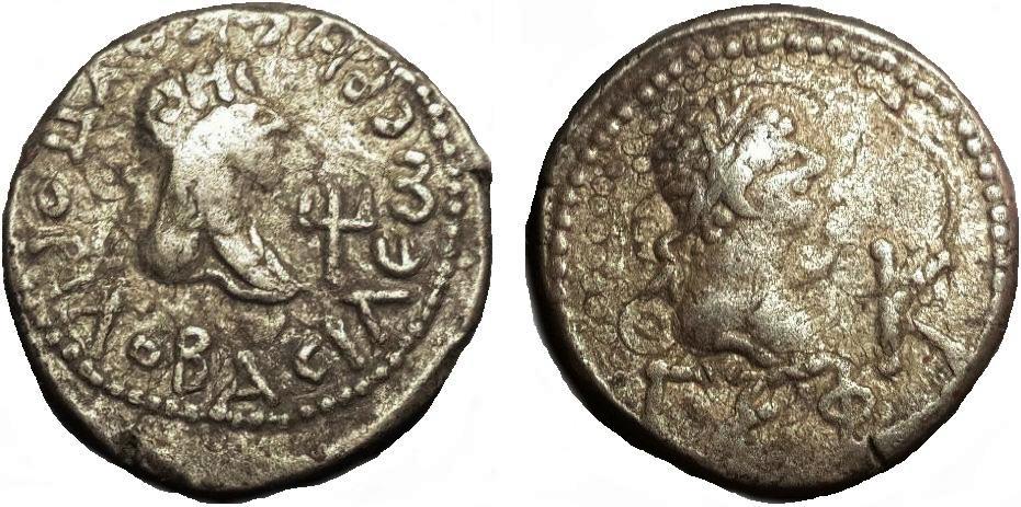- Бюст императора вправо, внизу год ΓΞΦ (563 г. б. э.), справа К