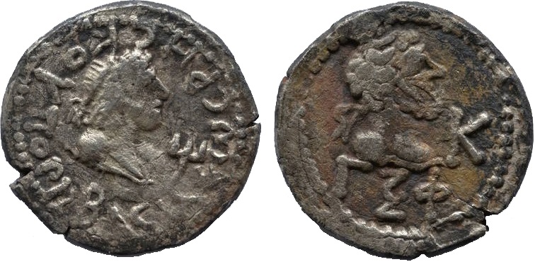 - Бюст императора вправо, внизу год ΓΞΦ (563 г. б. э.), справа К