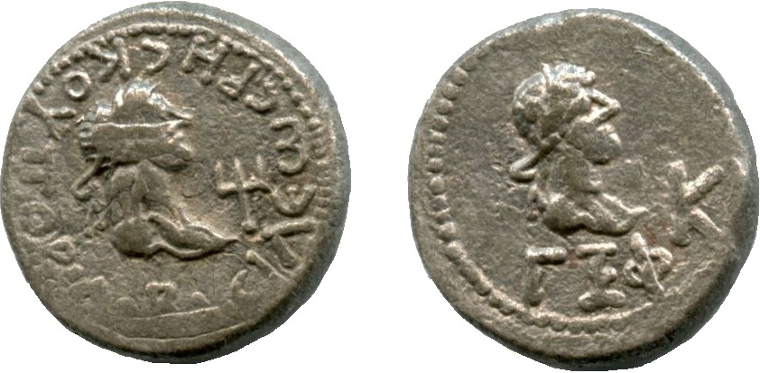 - Бюст императора вправо, внизу год ΓΞΦ (563 г. б. э.), справа К