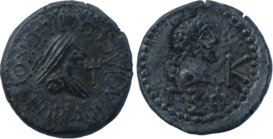 - Бюст императора вправо, внизу год ΓΞΦ (563 г. б. э.), справа К
