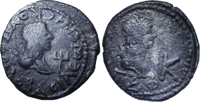- Бюст императора вправо, внизу год ΓΞΦ (563 г. б. э.), справа К