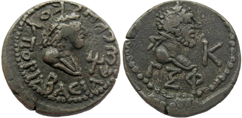 - Бюст императора вправо, внизу год ΓΞΦ (563 г. б. э.), справа К