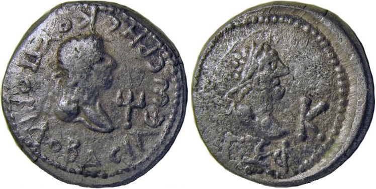 - Бюст императора вправо, внизу год ΓΞΦ (563 г. б. э.), справа К