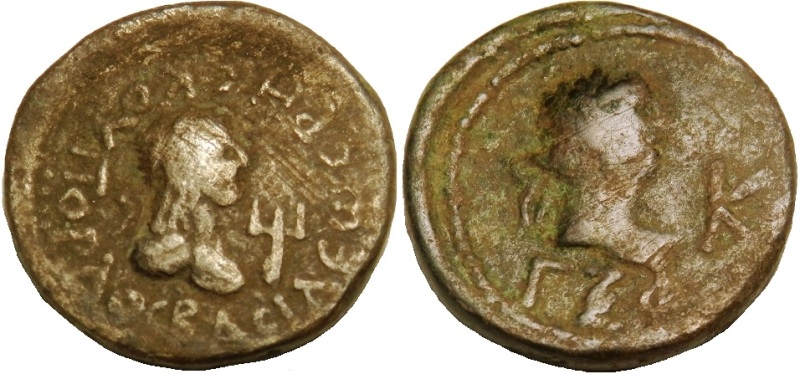 - Бюст императора вправо, внизу год ΓΞΦ (563 г. б. э.), справа К