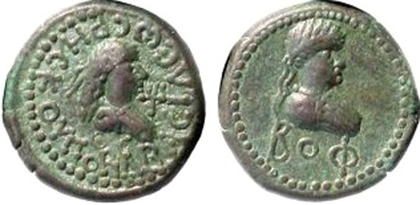 ΒΑCΙΛΕωC ΡΗCΚΟΥΠΟΡΙΔ (под бюстом ОС). Бюст царя вправо, «трезубец»
