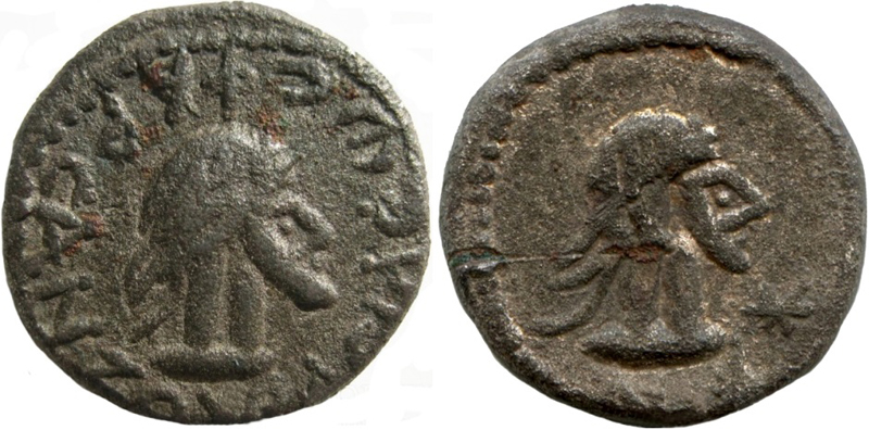 - Бюст императора вправо, год ΝΦ (550 г б.э.), справа «звезда»