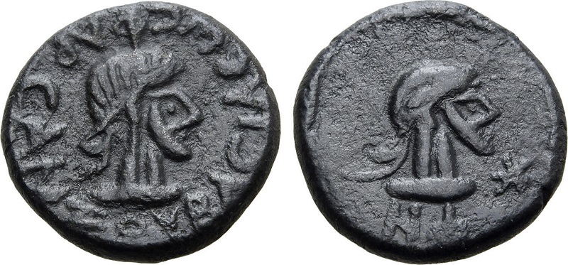 - Бюст императора вправо, год ΝΦ (550 г б.э.), справа «звезда»