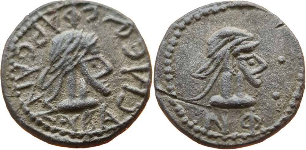 - Бюст императора вправо, год ΝΦ (550 г б.э.), справа «две точки»