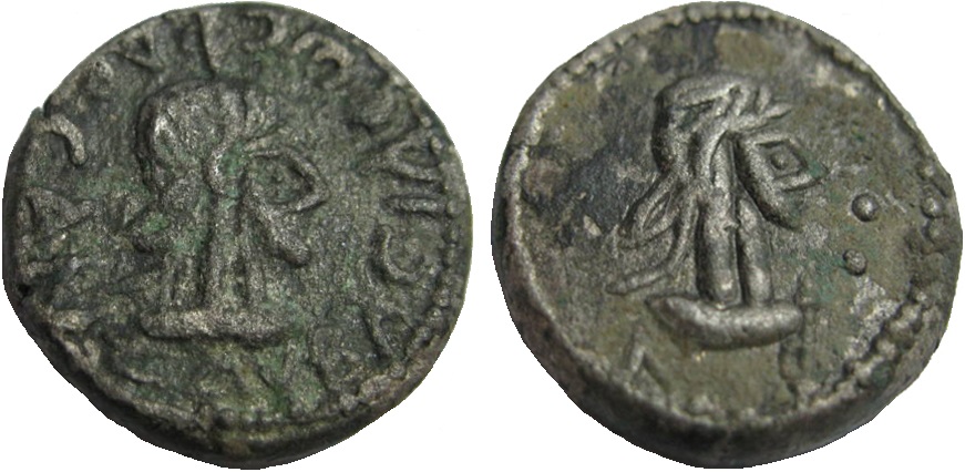 - Бюст императора вправо, год ΝΦ (550 г б.э.), справа «две точки»