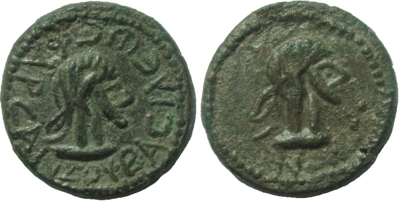 - Бюст императора вправо, год ΝΦ (550 г б.э.), справа «две точки»