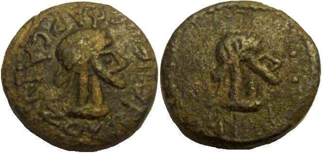 - Бюст императора вправо, год ΝΦ (550 г б.э.), справа «две точки»