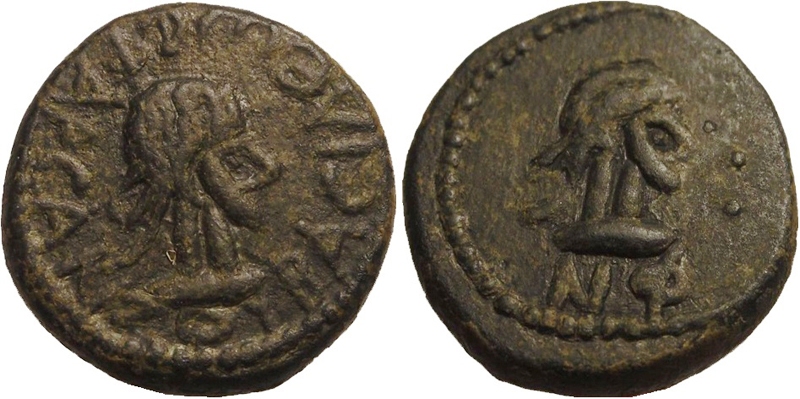 - Бюст императора вправо, год ΝΦ (550 г б.э.), справа «две точки»