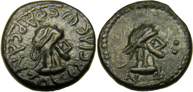 - Бюст императора вправо, год ΝΦ (550 г б.э.), справа «две точки»