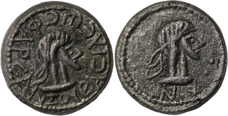 - Бюст императора вправо, год ΝΦ (550 г б.э.), справа «две точки»