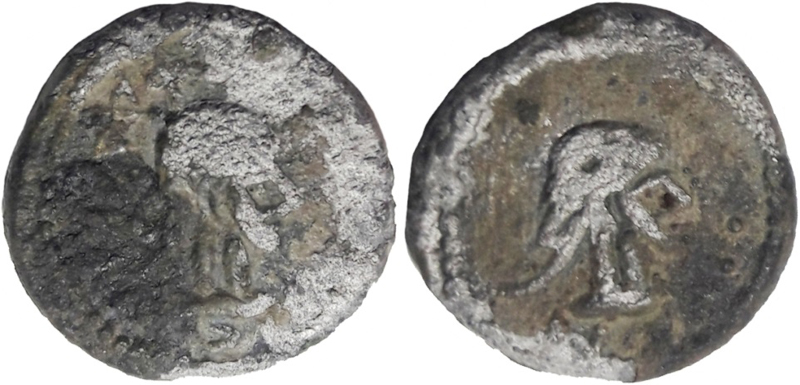 - Бюст императора вправо, год ΝΦ (550 г б.э.), справа «две точки»
