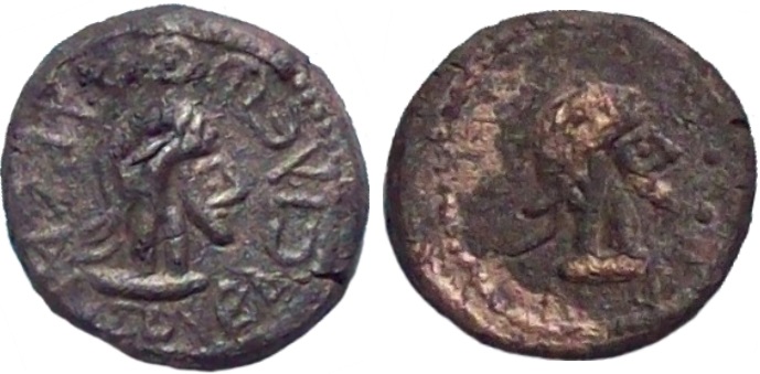 - Бюст императора вправо, год ΝΦ (550 г б.э.), справа «две точки»