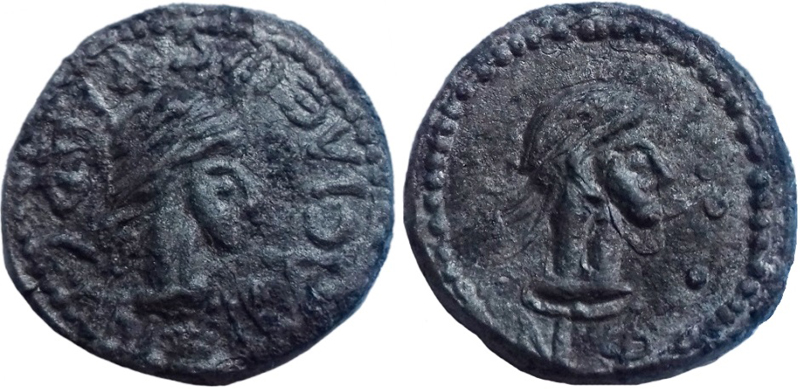 - Бюст императора вправо, год ΝΦ (550 г б.э.), справа «две точки»