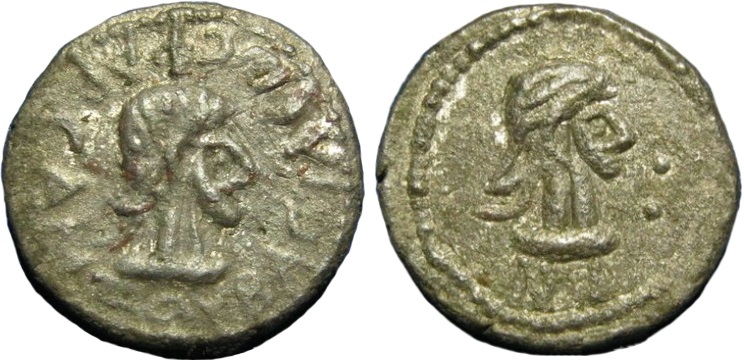 - Бюст императора вправо, год ΝΦ (550 г б.э.), справа «две точки»
