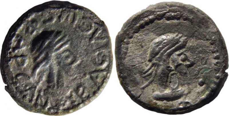 - Бюст императора вправо, год ΝΦ (550 г б.э.), справа «две точки»
