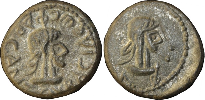 - Бюст императора вправо, год ΝΦ (550 г б.э.), справа «две точки»