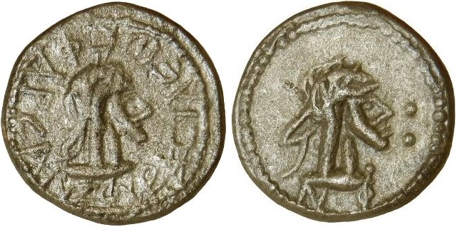 - Бюст императора вправо, год ΝΦ (550 г б.э.), справа «две точки»