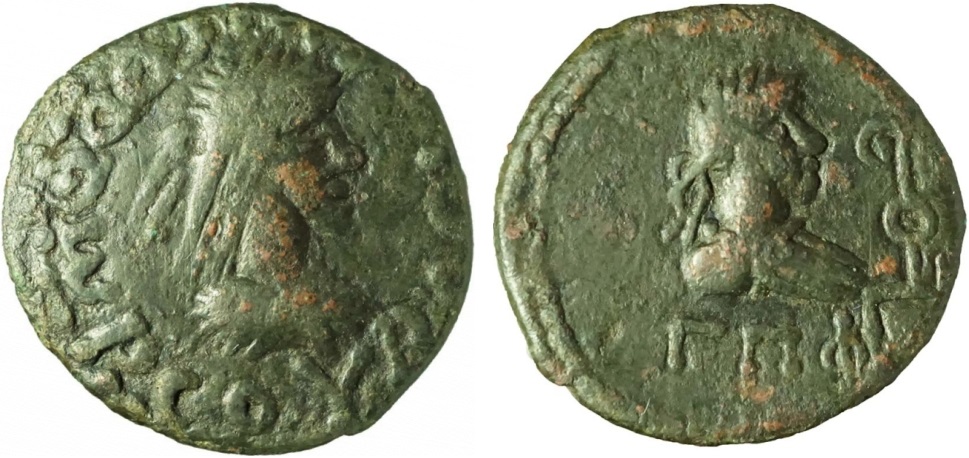 - Бюст императора вправо, тамга иной формы, год ΓΠΦ (583 г. б. э.)