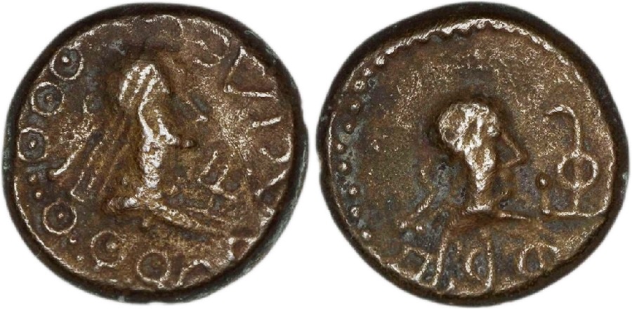 Бюст императора вправо, справа тамга, год ΒqΦ (592 г. б. э) или пΒqΦ