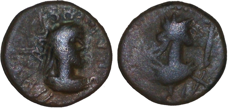 - Бюст императора вправо, справа «палица», внизу год ΔΙΧ (614 г. б. э.)
