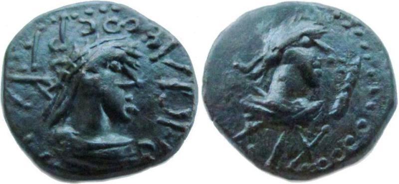 - Бюст императора вправо, справа «палица», внизу год ΔΙΧ (614 г. б. э.)
