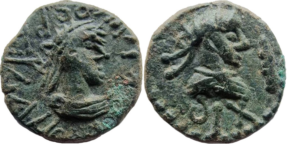 Бюст императора вправо, справа «палица», внизу год ΔΙΧ (614 г. б. э.)