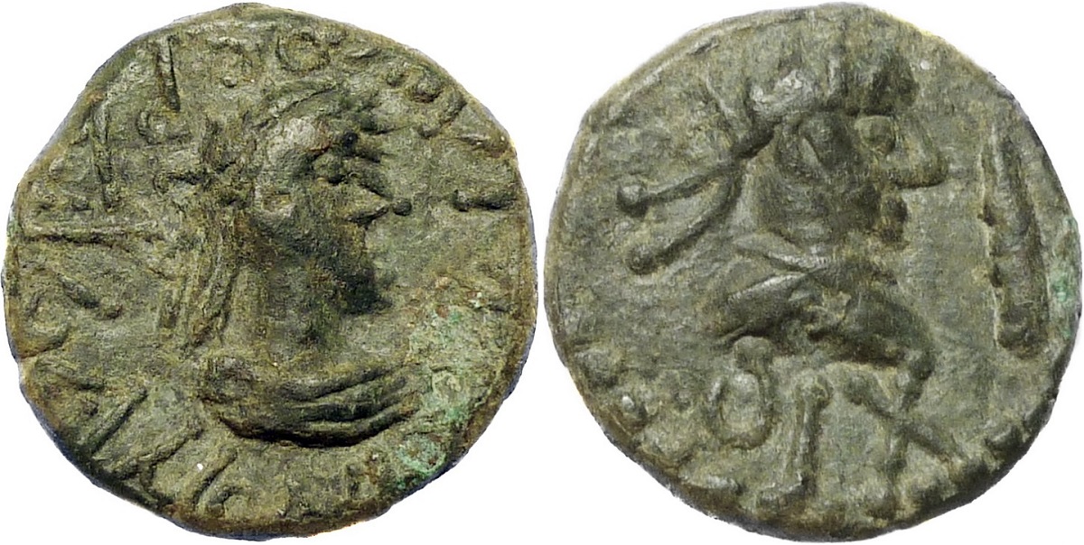 Бюст императора вправо, справа «палица», внизу год ΔΙΧ (614 г. б. э.)