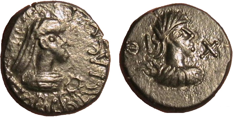 - ΒΑCΙΛΕωC ΡΗCΚΟΥΠΟΡΙC. Бюст царя вправо, справа «венок»