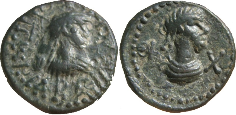- ΒΑCΙΛΕωC ΡΗCΚΟΥΠΟΡΙC. Бюст царя вправо, справа «венок»