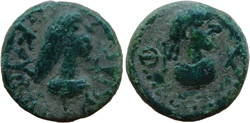 - ΒΑCΙΛΕωC ΡΗCΚΟΥΠΟΡΙC. Бюст царя вправо, справа «венок»