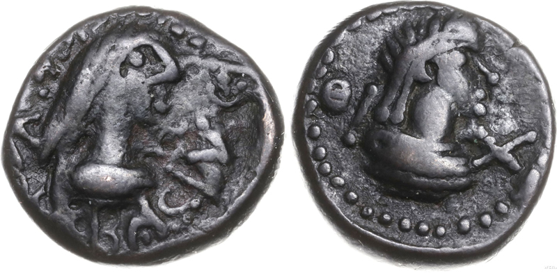 - ΒΑCΙΛΕωC ΡΗCΚΟΥΠΟΡΙC. Бюст царя вправо, справа «венок»