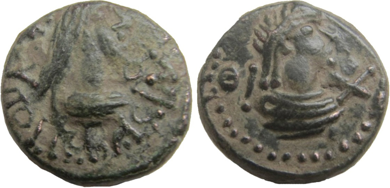 - ΒΑCΙΛΕωC ΡΗCΚΟΥΠΟΡΙC. Бюст царя вправо, справа «венок»