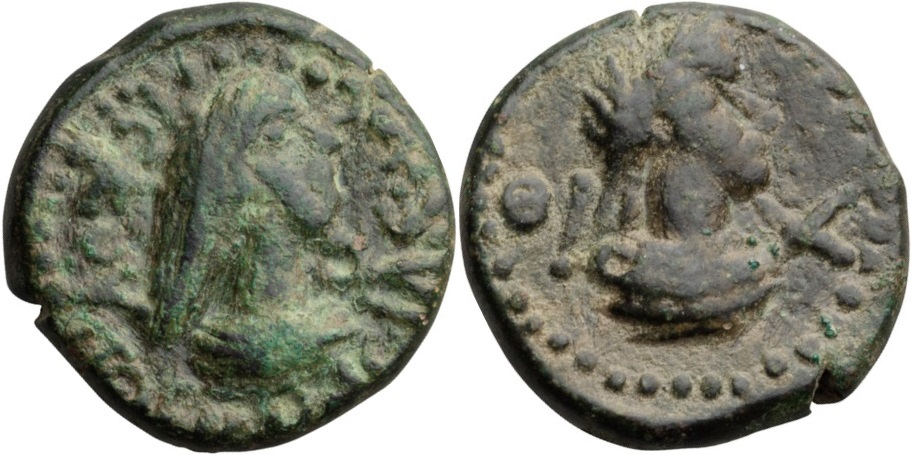 - ΒΑCΙΛΕωC ΡΗCΚΟΥΠΟΡΙC. Бюст царя вправо, справа «венок»