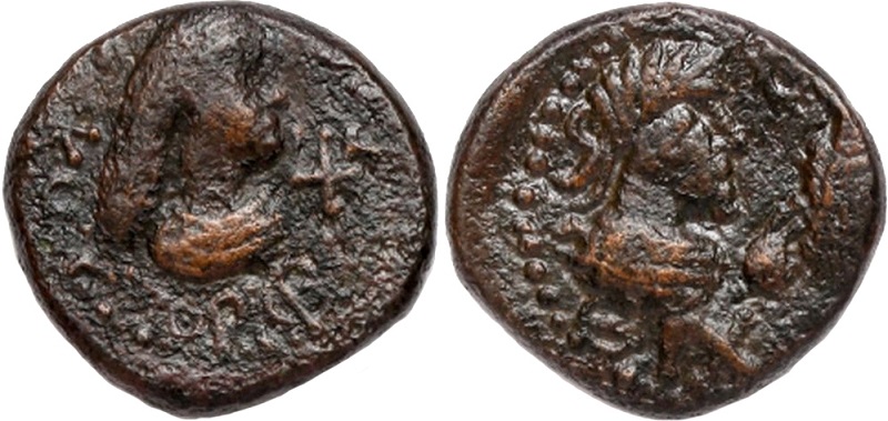 Бюст императора вправо, внизу год ΘΙΧ (619 г. б.э.), справа орел на шаре с венком в клюве
