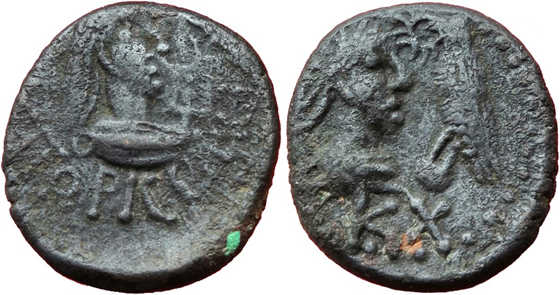 - ΒΑCΙΛΕωC ΡΗCΚΟΥΠΟΡΙC. Бюст царя вправо, справа трезубец