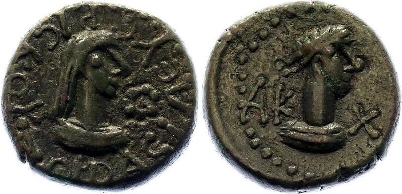 - ΒΑCΙΛΕωC ΡΗCΚΟΥΠΟΡΙC. Бюст царя вправо, справа «венок»