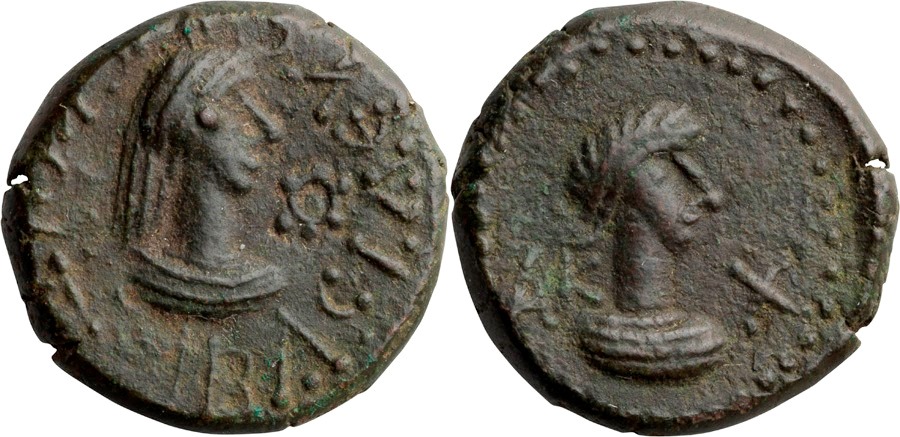 - ΒΑCΙΛΕωC ΡΗCΚΟΥΠΟΡΙC. Бюст царя вправо, справа «венок»