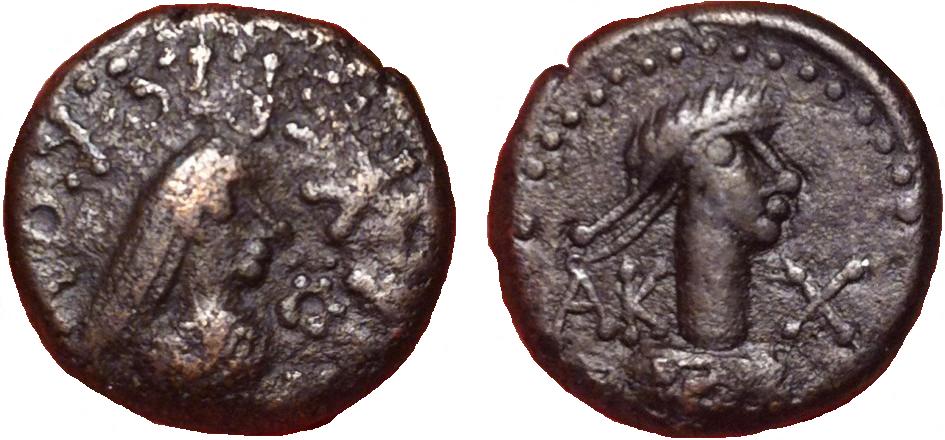 - ΒΑCΙΛΕωC ΡΗCΚΟΥΠΟΡΙC. Бюст царя вправо, справа «венок»
