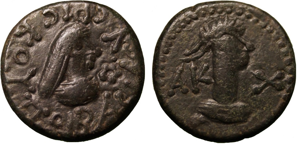- ΒΑCΙΛΕωC ΡΗCΚΟΥΠΟΡΙC. Бюст царя вправо, справа «венок»